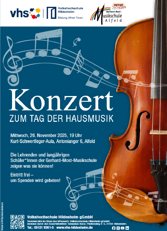 Der Tag der Hausmusik findet in diesem Jahr am 26. November 2025 ab 19:00 Uhr in der Kurt-Schwertfesger-Aula , Antonianger 6 in Alfeld.